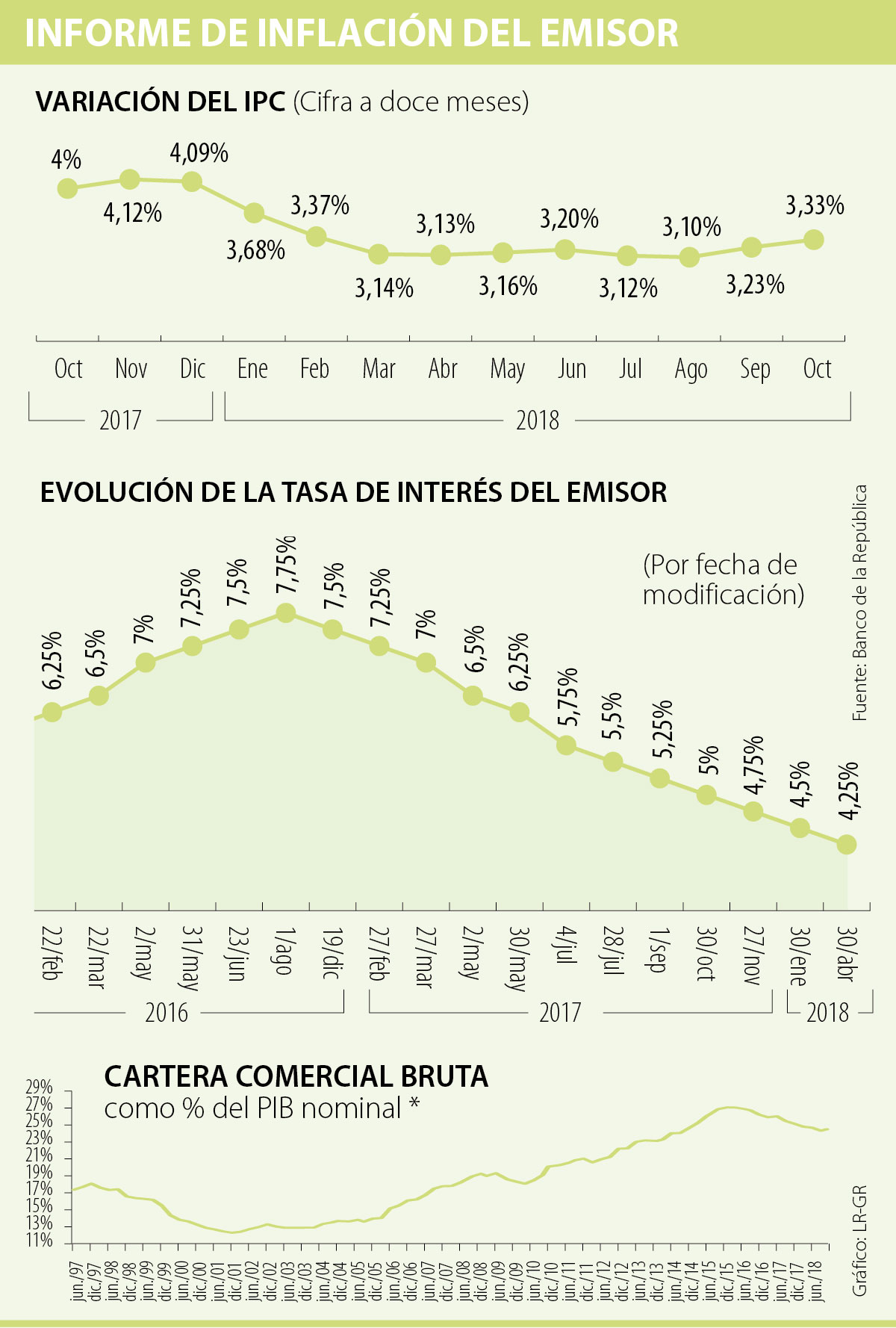 “Hasta ahora, las expectativas del próximo año están cercanas a 3,3%. En este momento, tenemos buenas noticias: un IPC de 3,30% y si se le quita alimentos de 3,78%. Hacia mediados de 2019, se espera que la inflación regrese al rango meta de 3%”, indicó el gerente del Emisor, Juan José Echavarría en la presentación del último Informe sobre Inflación.